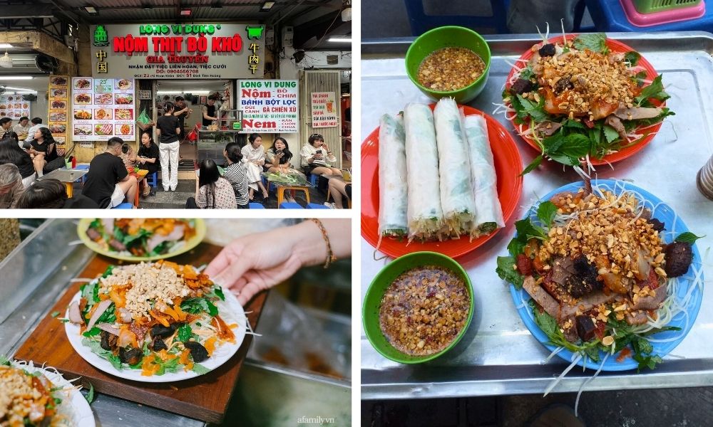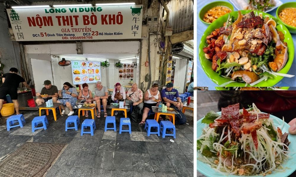 Long Vi Dung is one of the most famous places to enjoy Nộm khô bò in Hanoi. The salad here is known for its generous topping of dried beef, crunchy papaya, and perfectly balanced sauce. Despite being a sidewalk stall, it attracts crowds of both locals and tourists every day.